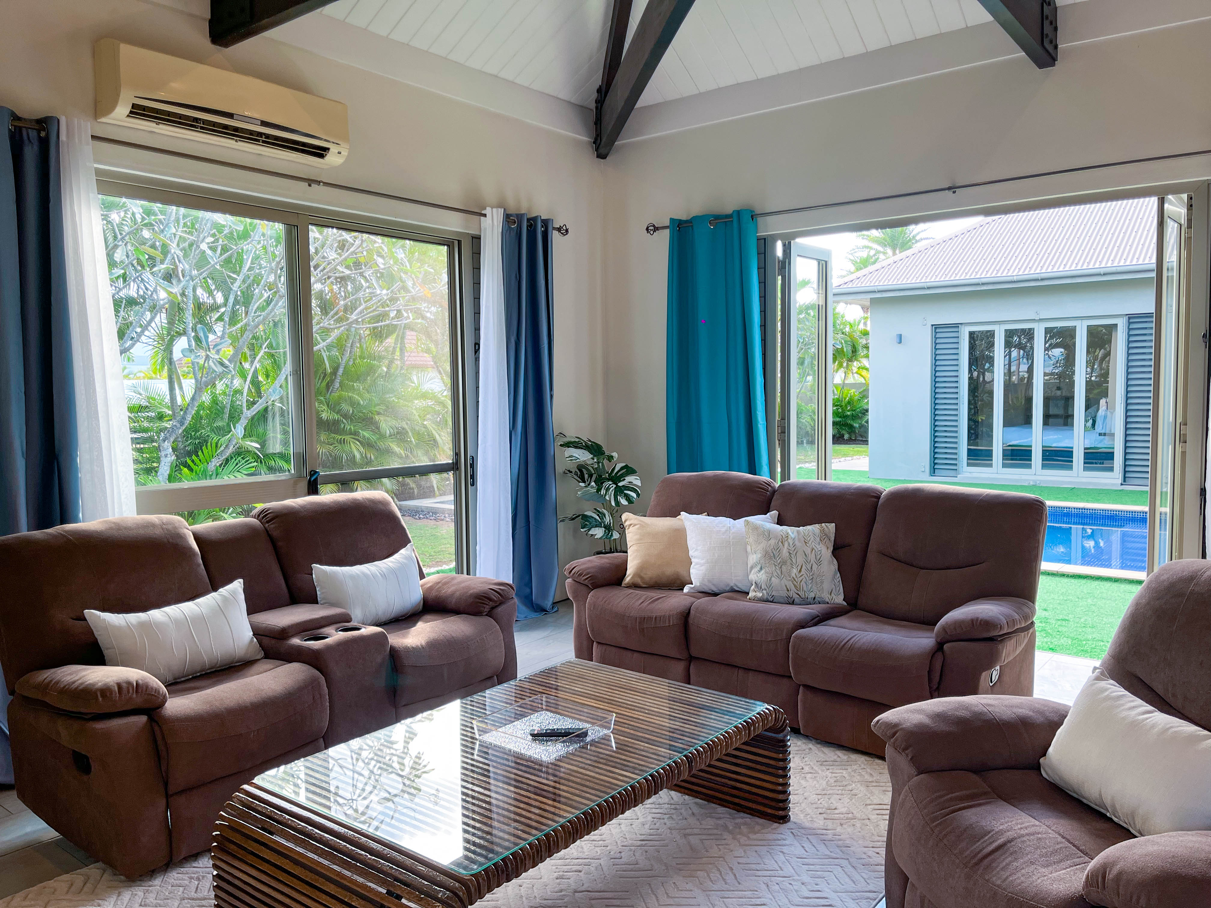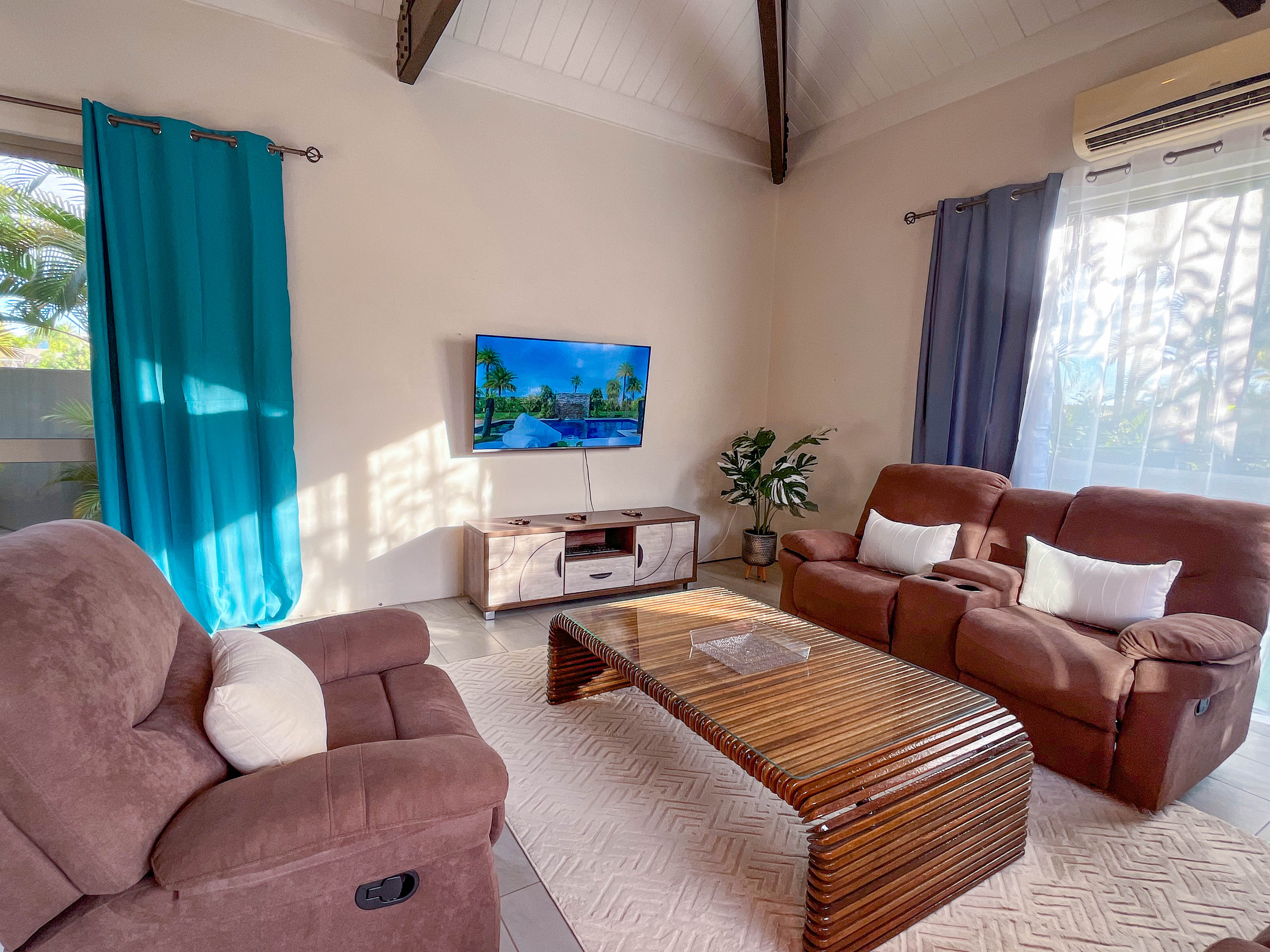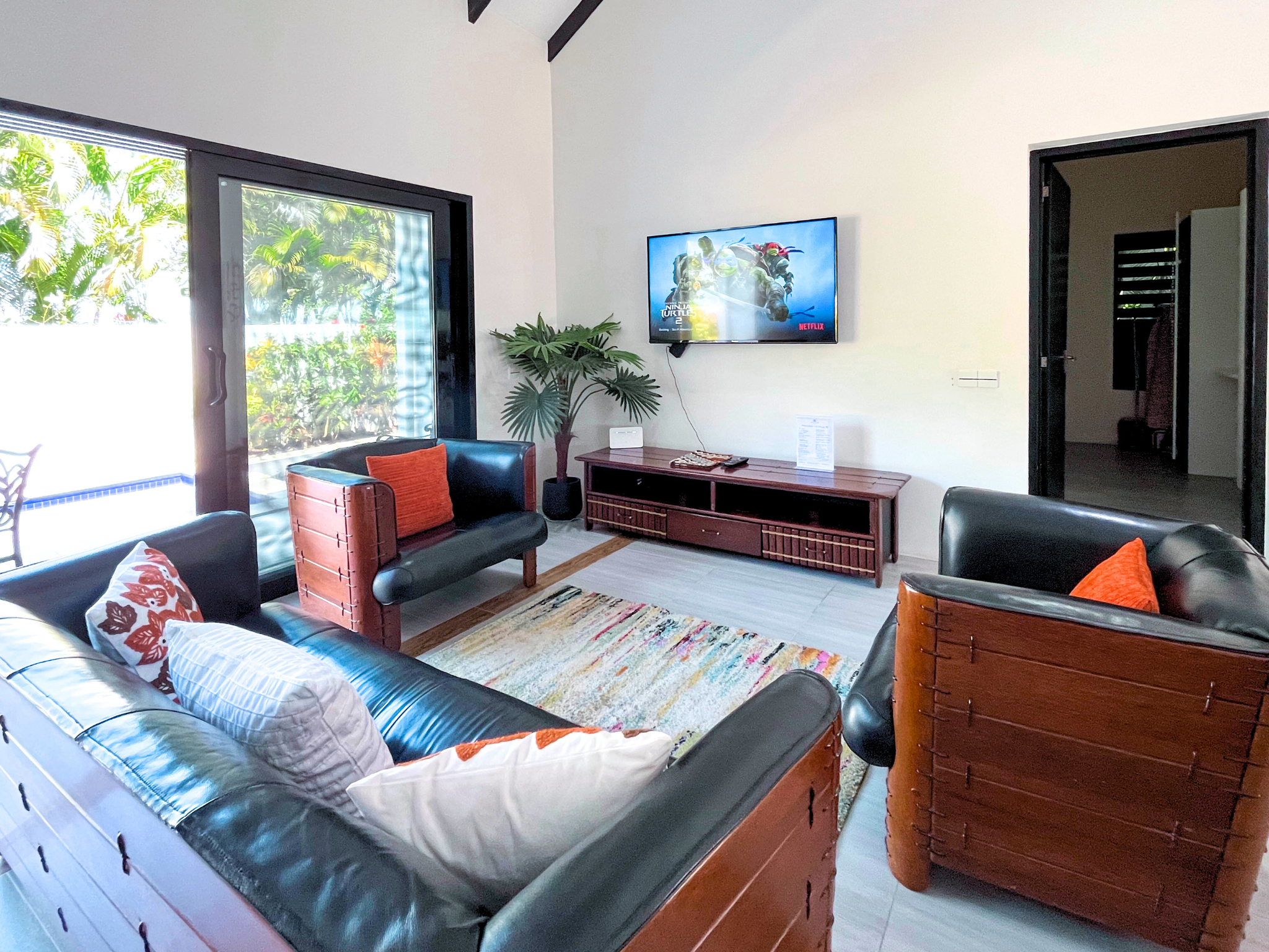 As you step into Villa 100, you'll be greeted by a spacious and tastefully decorated living area, complete with comfortable sofas, a large flat-screen TV, and plenty of natural light.