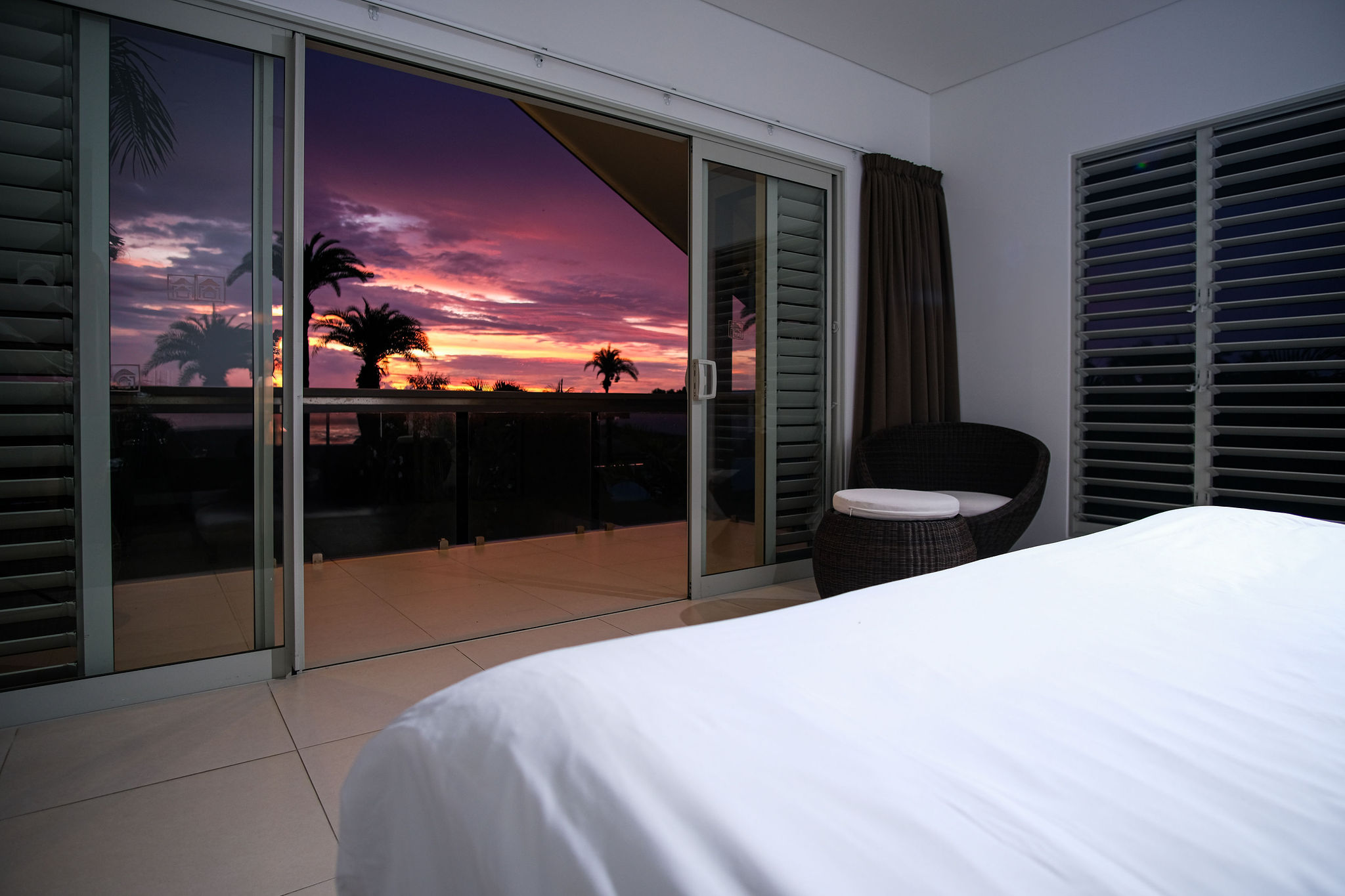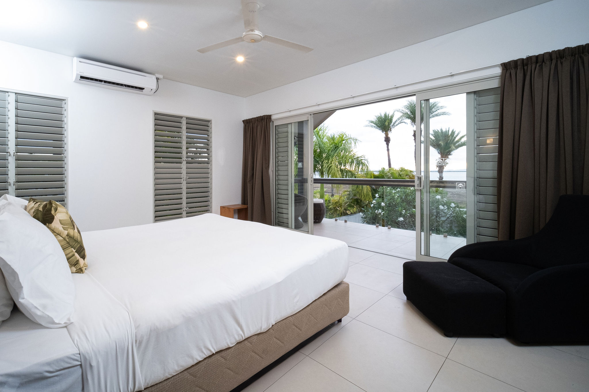 Room 1 Master bedroom, ensuite bathroom and toilet with king sized be and view of the pool