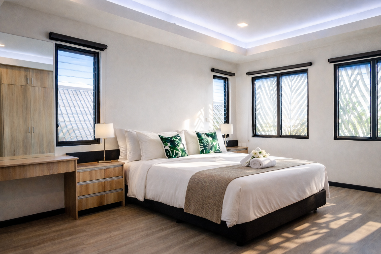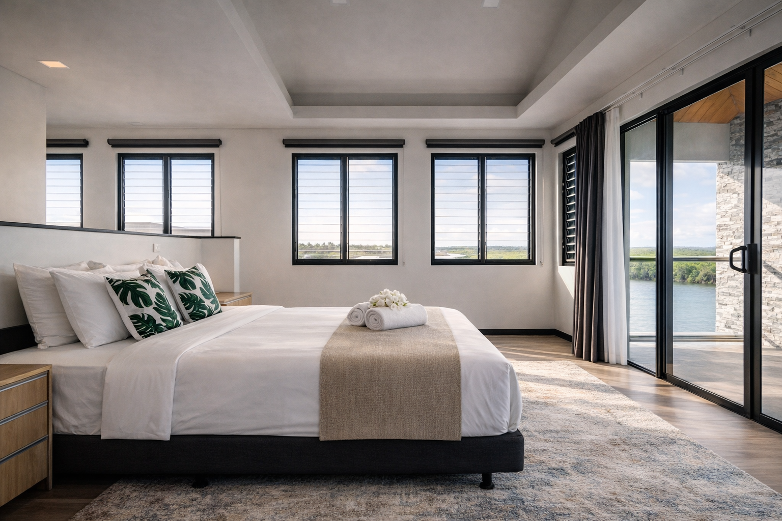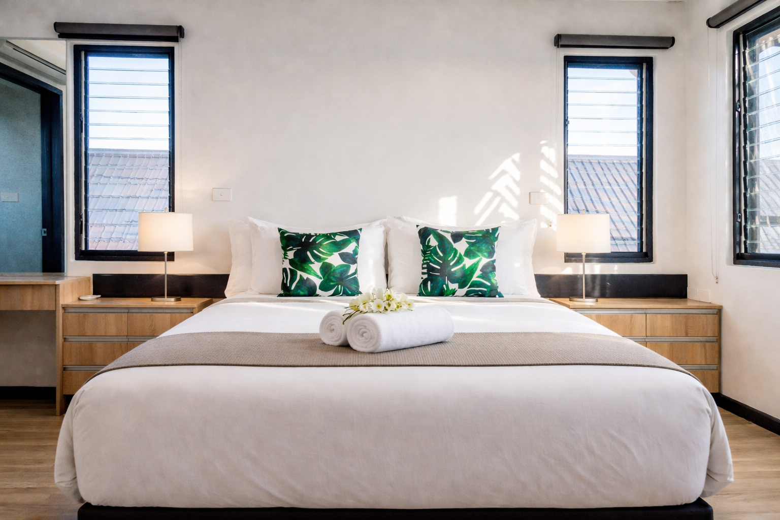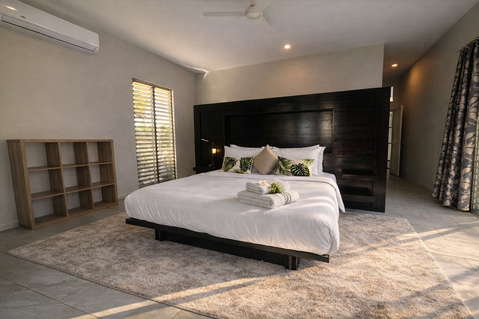 The villa features four upstairs bedrooms, each appointed with king beds, private ensuites, and walk-in wardrobes. Two of the bedrooms overlook the pool and open onto private balconies, offering a peaceful outlook across the property.
