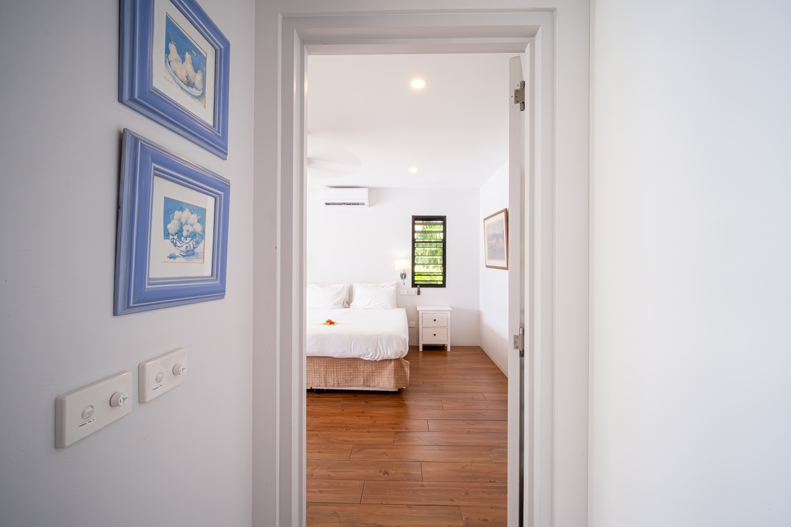Room 2: Upstairs with a king bed, ensuite bathroom, and balcony overlooking the pool
