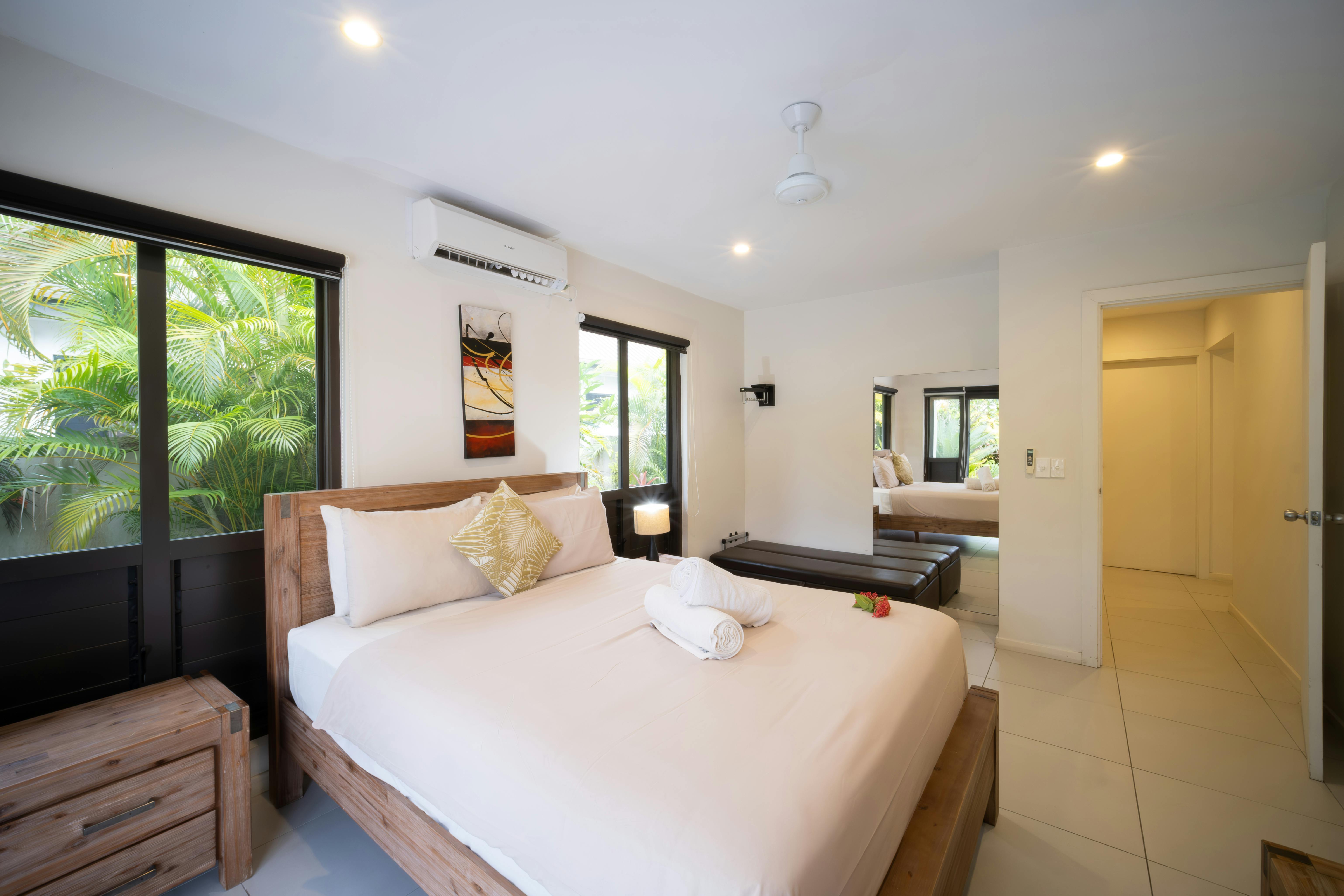 Room 1: Upstairs with a king bed, ensuite bathroom, and balcony overlooking the pool